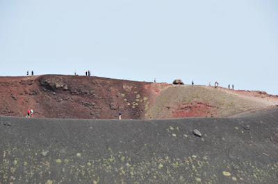 Dann rauf auf den Ätna, da war vergleichsweise noch wenig los - früh in der Jahreszeit, denke ich; oben lag noch Schnee an kalten Stellen. Sehr beeindruckend, ich hab die volle Tour gemacht mit Seilbahn und Rangerover-Bussen, so weit man halt kann (2.700 m). Der Gipfel des Hauptkraters ist dann noch einmal fast 700 m höher und raucht und rumort gewaltig! Es gibt zahlreiche aktive Nebenkrater, typisch für den Ätna und bes. gefährlich, und um solch einen bin ich mit einem Guide (italienische Bergwacht, tatsächlich!) in einer kleinen Gruppe gelaufen. Die Sonne schien, so gut sie es durch die Rauchschwaden konnte, es war sehr windig und ziemlich frisch dort oben. Das Ganze hat dann etwas länger gedauert als gedacht, da ich mich zu dieser Exkursion ganz kurzfristig entschlossen hatte - ich war gar nicht passend angezogen und musste mir sogar Bergschuhe leihen. Immerhin, die gabs da für 2 €. Geht also nicht nur mir so...